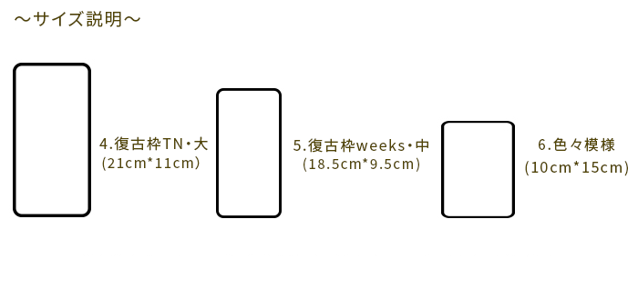 ↓4.復古枠TN・大(21cm*11cm)と5.復古枠weeks・中(18.5cm*9.5cm)の柄となります。