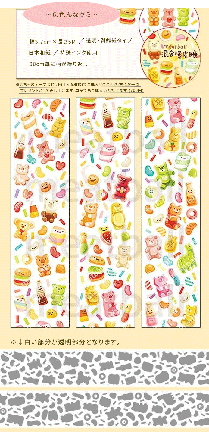6.色んなグミ(幅3.7cm*長さ5M・柄は38cm毎に繰り返し・透明テープ)←セットのおまけテープの単品販売!!