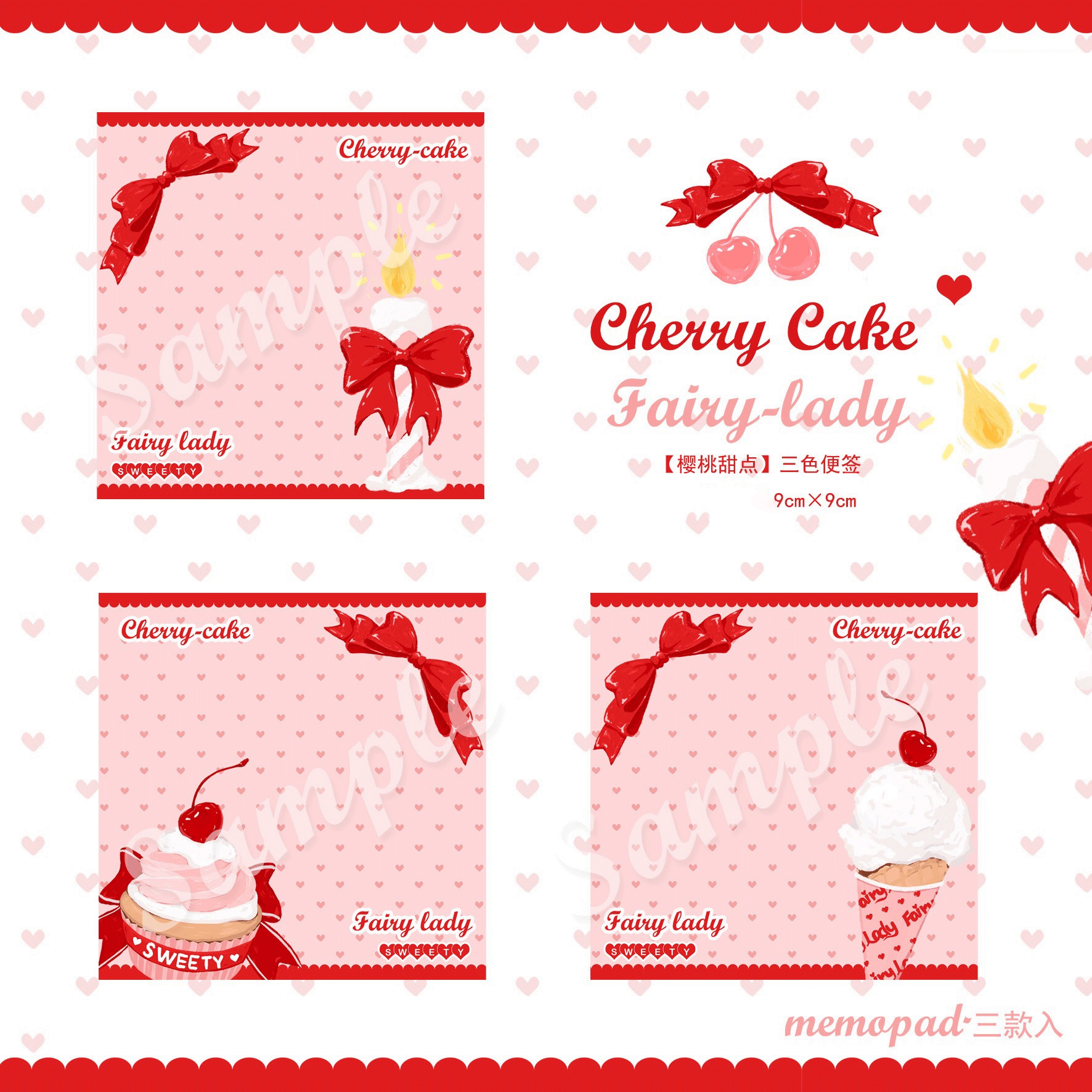 ↓7.Sweety cherry リボンメモ(9cn*9cm) 3種*各20の計60ページ