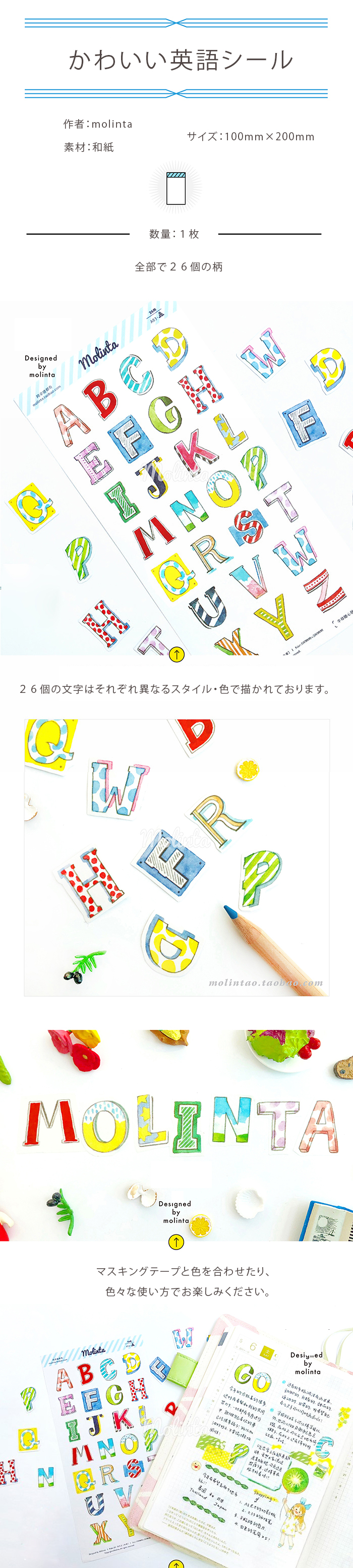 1.かわいい英語シール(100mm*200mm 1枚 計26柄)